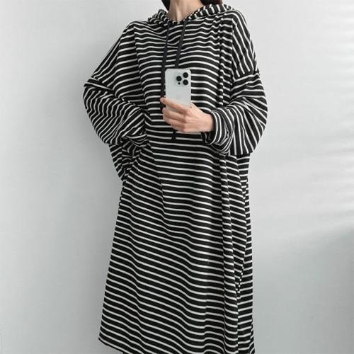 [다잇템][다잇템] 여자 후디 코튼 큰사이즈 콘트라스트 줄무늬 실내복 롱원피스_24432389_588872