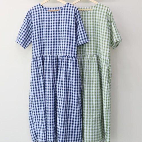 [옷자락] 여자 심플 면혼방 고방체크 루즈핏 반팔 롱 원피스