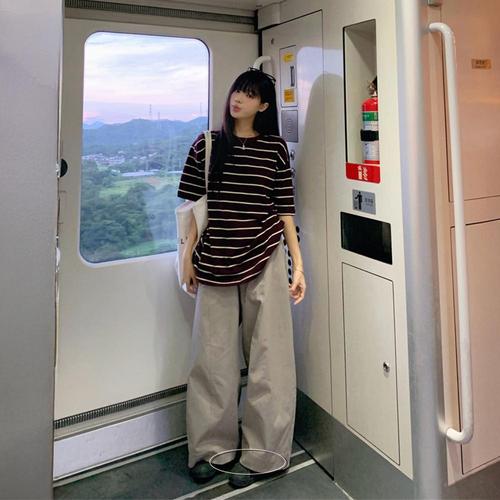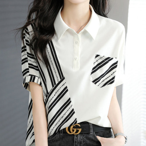ANYOU 여성 버튼넥 스트라이프 반팔 티셔츠 카라 순면 루즈핏 반팔티