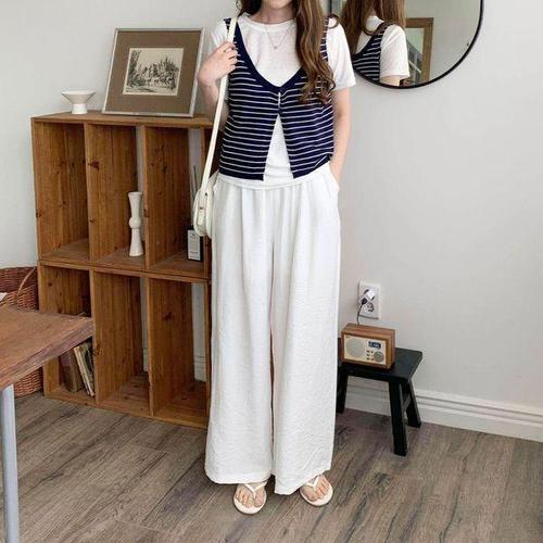 [셀러허브_여성트랜드패션]ONM 캐주얼 줄무늬 니트 반팔티 슬림핏 오피스룩 시원