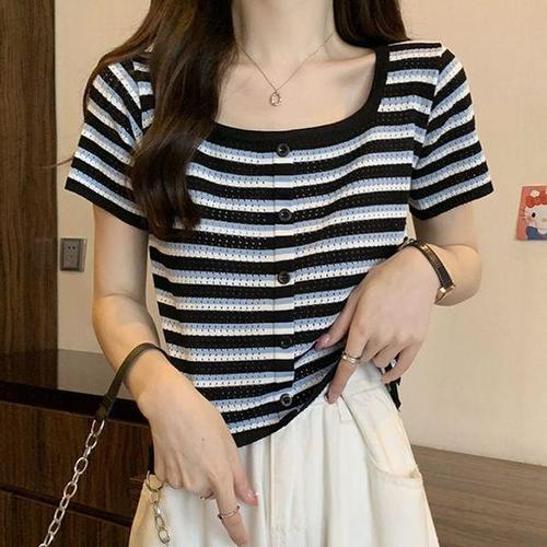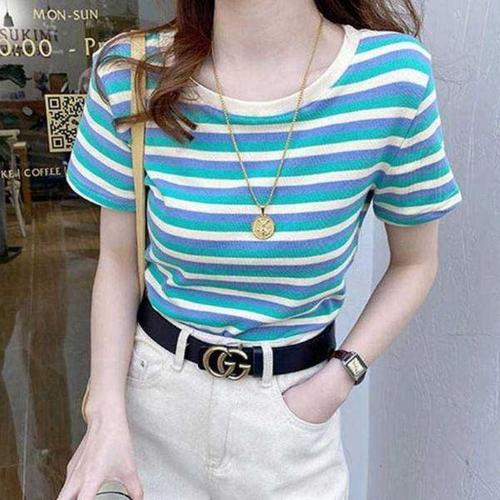 스트라이프 여자 반팔 티셔츠 슬림 여성 여름 반팔티