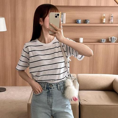 [옷자락] 여자 라운드넥 스트라이프 세미 크롭 신축성 반팔티