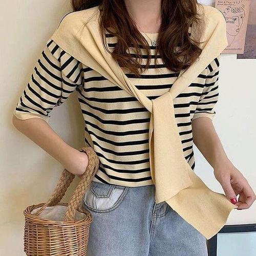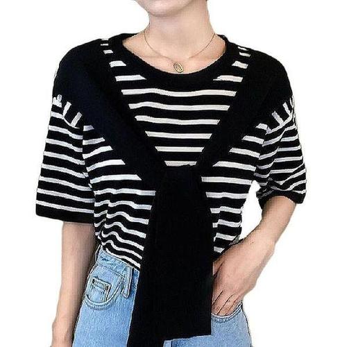 [셀러허브_여성트랜드패션]ONM 여성 스트라이프 티셔츠 니트 페이크숄 반팔티