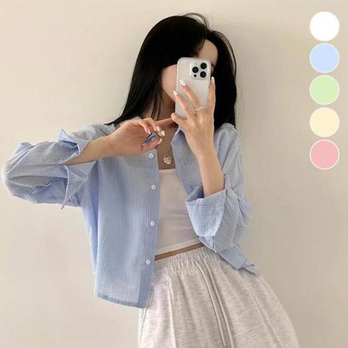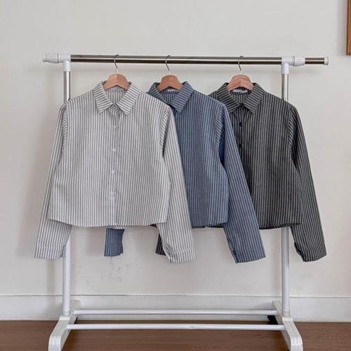[옷자락]여자 봄여름 코튼 스트라이프 크롭 셔츠