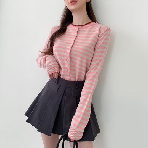 [셀럽하우스]봄 KSFT8418 가을 여자 반크롭 스트라이프 가디건 긴팔 티셔츠