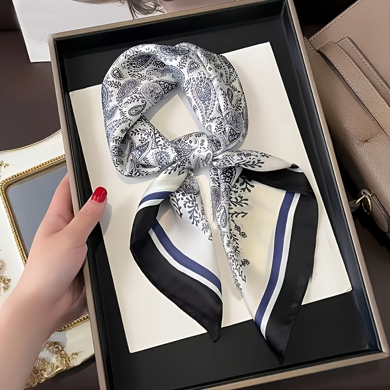 TEMU 우아한 페이즐리 패턴 헤드스카프 - 70.0cm 정사각형 새틴 스카프, 부드럽고 가벼운 화이트에 블루와 블랙 플로럴 프린트, 여성 패션, 헤어 액세서리, 넥커치프, 손수건으로 완벽 | 패션 액세서리 | 프린트 새틴