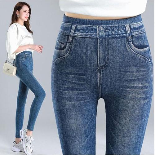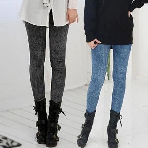 여성 블루 블랙 페이크 데님 레깅스 WFLQWIZ