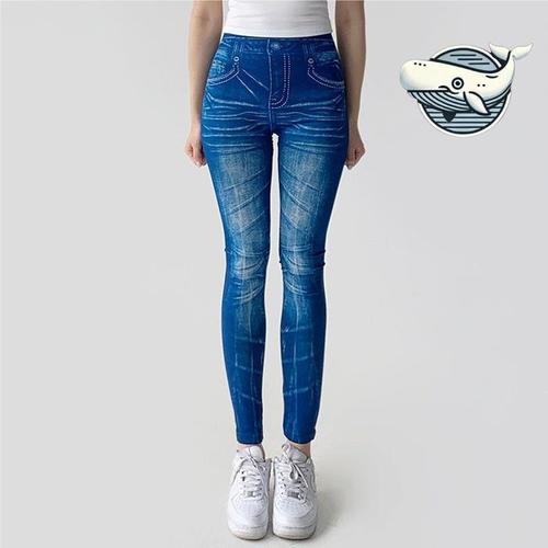 푸시 업 원활한 하이 웨이스트 가짜 데님 레깅스 여성 캐주얼 탄성 포켓 청바지 프린트 바지 스키니 펜슬 레깅스 Mujer