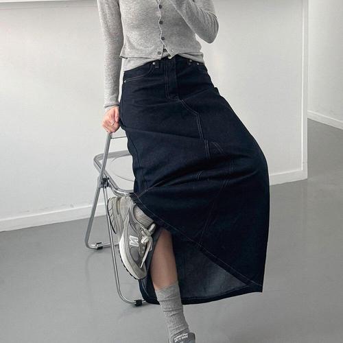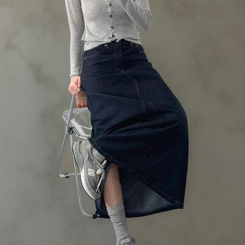 [드레스날다]언밸런스한 H라인 옆트임 데님 롱스커트(mskt1243)