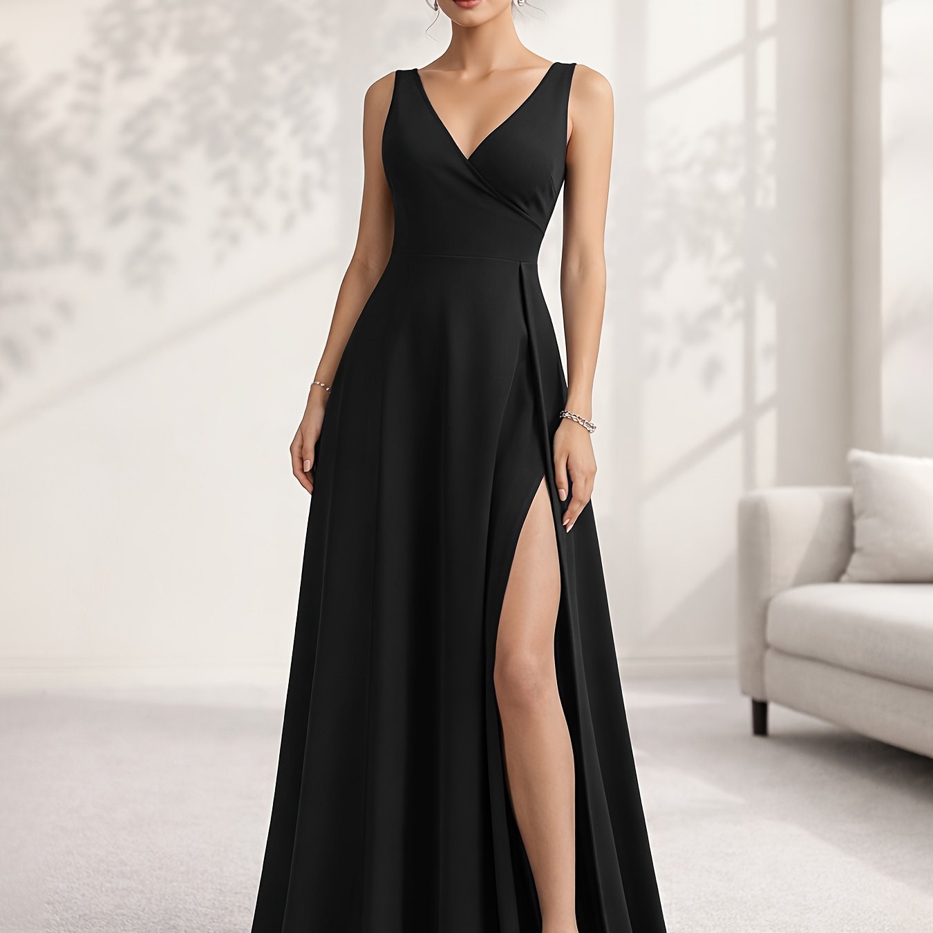 TEMU 여성 민소매 V넥 롱 드레스, 하이웨스트 및 허리 라인, 사이드 하이 슬릿, 플로잉 A라인 실루엣, 단색, 크로스넥, 포멀 파티 웨어, 올 시즌, 성인, 우아한 이브닝 가운