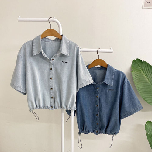허니제이 / 델라슨 자수 레터링 허리 스트링 반팔 데님 셔츠(2color)