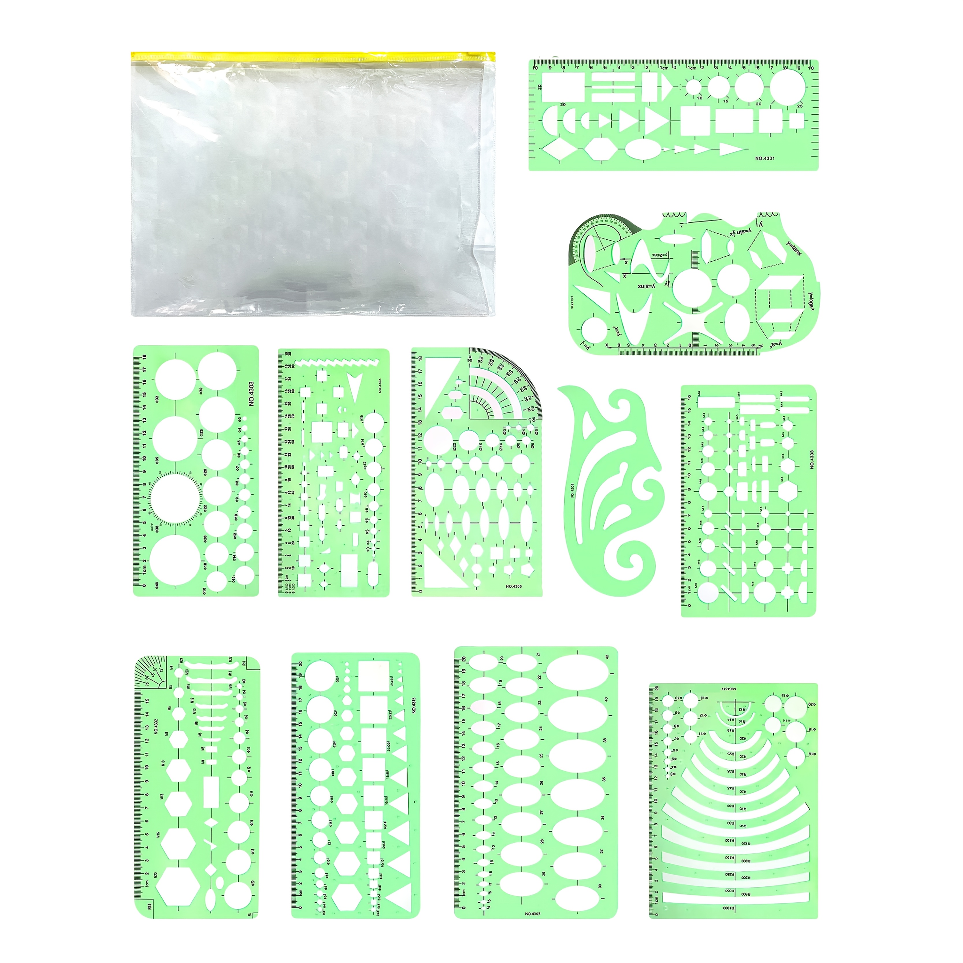 TEMU 11피스 기하학 도형 그리기 템플릿 세트 + 측정자 포함 - 녹색 투명 플라스틱 도구+보너스 PE 지퍼백 - 건축, 기계공학, 사무실, 학습, 디자인, 수학, 패션 디자인용