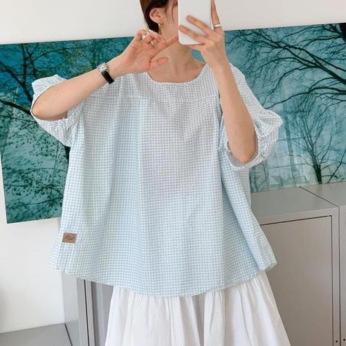[다잇템]여성 벌룬 박시핏 등원룩 격자 코튼 블라우스 (14723526A)