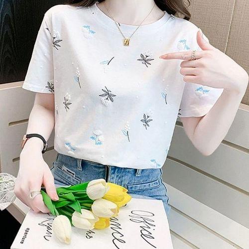 [에이치플러스몰]여성용 화이트 플라워 패턴 반팔 여름 티셔츠 데일리웨어