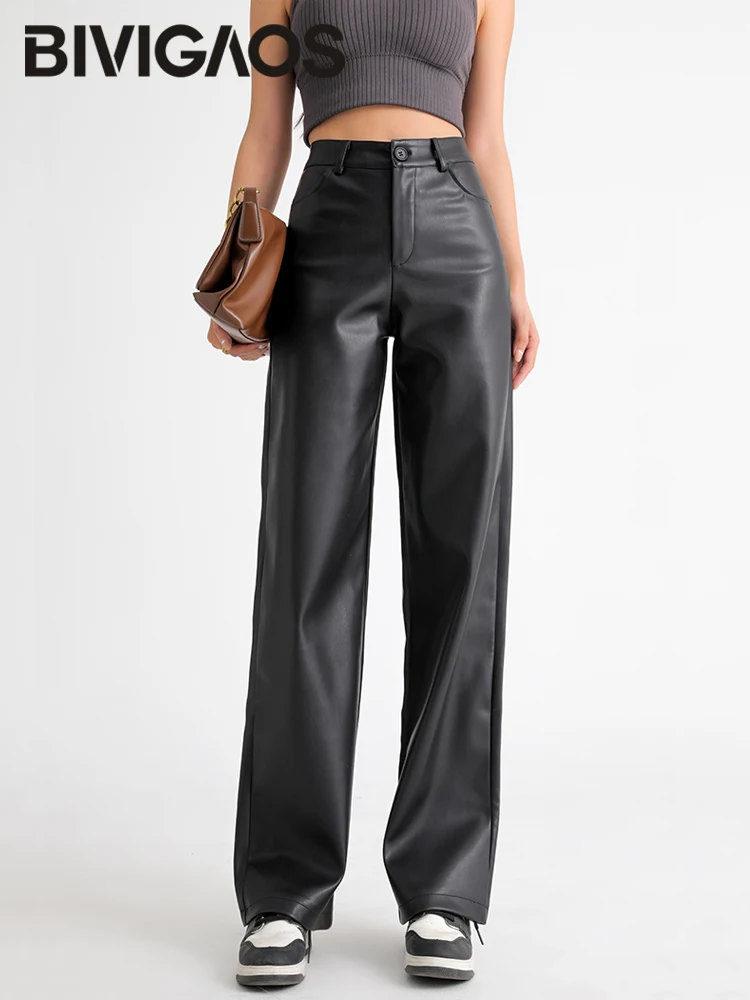 BIVIGAOS 가을 겨울 양털 느슨한 넓은 다리 따뜻한 가죽 바지 여성 버튼 포켓 하이 웨이스트 두꺼운 PU 캐주얼 스트레이트 바지