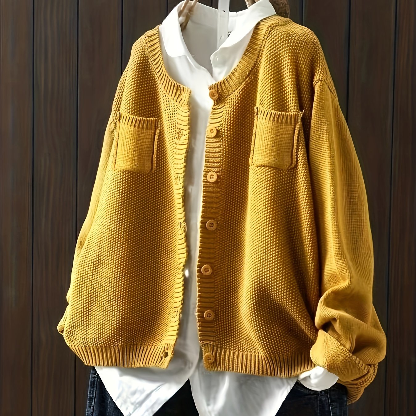TEMU 여성용 빈티지 가디건 - 두꺼운 편안한 롱슬리브 라운드넥 솔리드 컬러 스웨터, 기계 세탁 가능 캐주얼 가을 겨울 레이어링 필수 아이템, 가을 옷장에 꼭 필요한 텍스처 니트웨어|가디건
