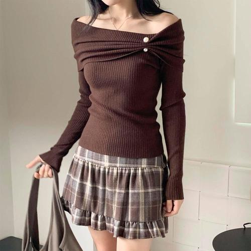 [옷자락] 여자 러블리 오프숄더 진주단추 골지 셔링 니트