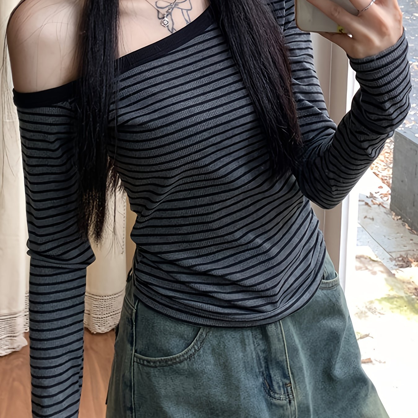 TEMU 여성 오프숄더 긴팔 티셔츠 - 루즈핏 캐주얼 탑, 러플 헴, 부드러운 데일리 셔츠 (봄/가을, 오피스, 파티, 외출용) - 간편한 관리 여성 의류, 여성 티셔츠, 봄 가을 의류, 오프숄더 디자인, 파티 의상|티셔츠