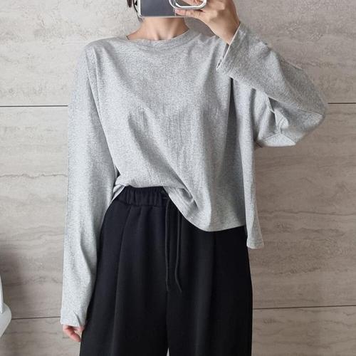 [유야]여성 면 무지 라운드 세미 크롭 긴팔 티셔츠 -FTS0527- 봄 가을
