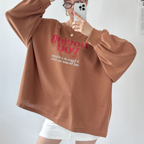 옷자락 / 여자 오버핏 퍼프 쭉티 라운드 레터링 가을 면 티셔츠