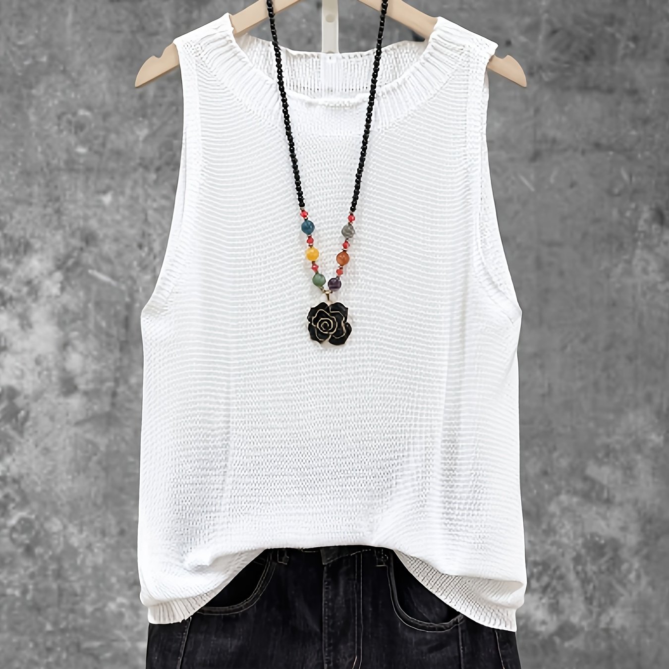 TEMU 여성용 레트로 문학 스타일 민소매 베스트 - 솔리드 컬러 라운드넥 탑, 중간 신축성, 봄 여름 가을 캐주얼 우아한 레이어링 피스, 휴가 및 야외 활동용, 시즌 패션, 심플하고 우아한 디자인, 고품질 니트웨어