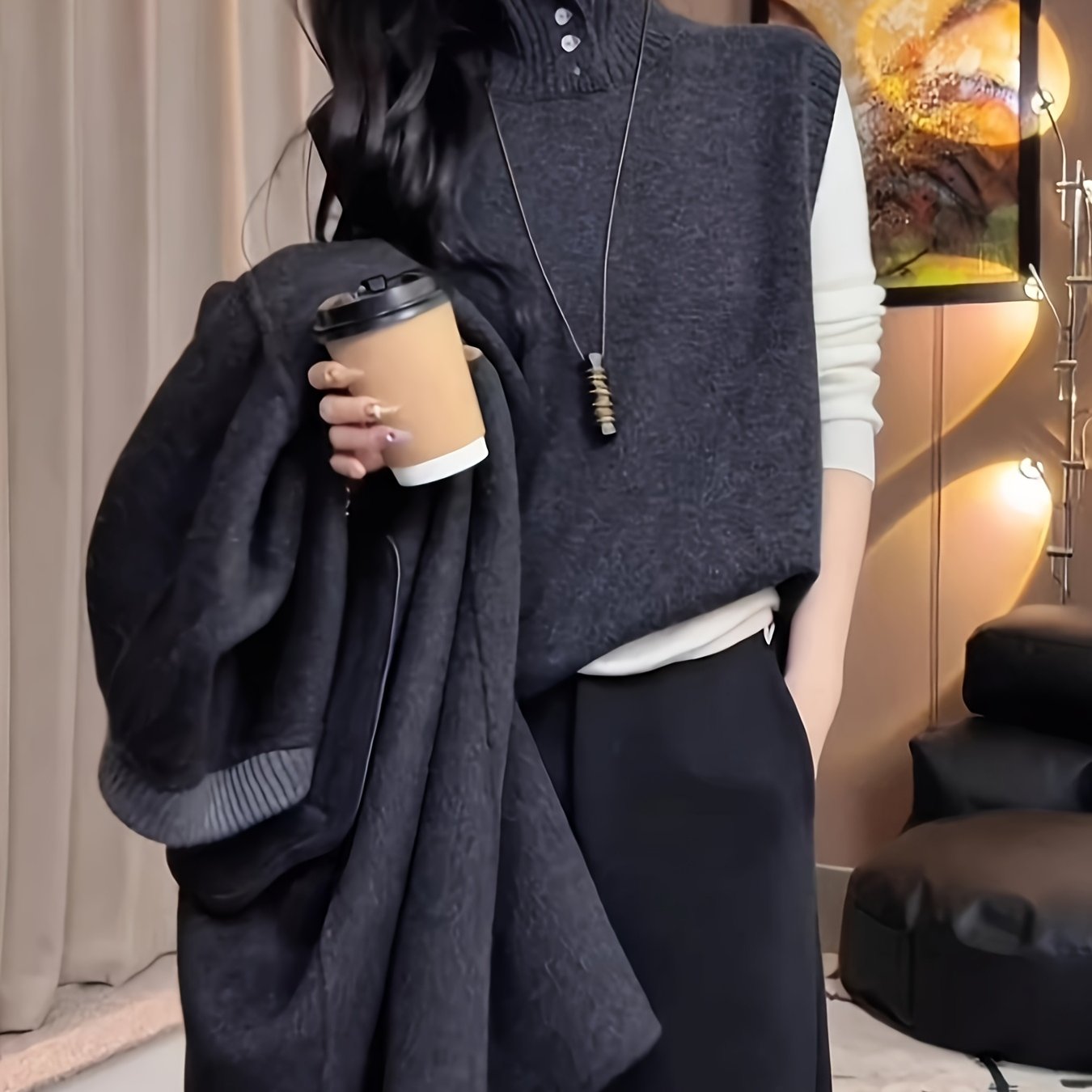 TEMU 여성용 겨울 고넥 스웨터 조끼 - 세련된 비대칭 디자인, 부드러운 스트레치, 단색 (블랙/브라운/그레이) 사무실 & 캐주얼 착용, 출퇴근복, 편안한 니트웨어