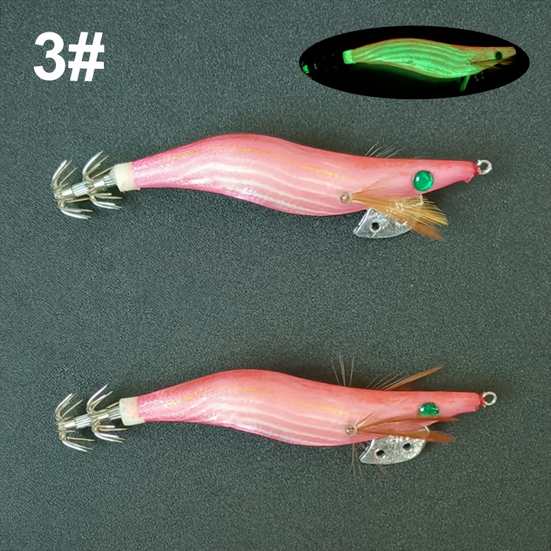TEMU 2개 세트 발광 오징어 미끼 - 3단 트레블 훅 장착, 핑크 & 그린 야광 해수 낚시 루어 (2.5#/3# 사이즈), 생선 모양 실물 같은 목재 디자인, 깊은 바다 낚시에 적합한 자연스러운 빛나는 미끼