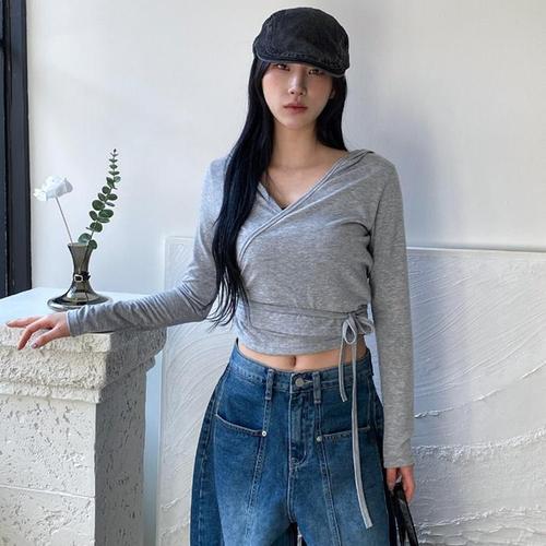 [다잇템]여자 랩 세미크롭 사이드스트랩 레이온 긴팔티 (32117778A)