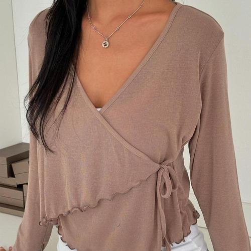 감성갤러리 볼륨 여성 브이넥 셔링 골지 긴팔 랩 티셔츠 글램룩 페미닌룩 E-C095