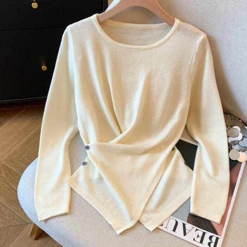 슈팅스타 / 숏 랩 단추 라인 언발 셔링 슬림 니트 티셔츠