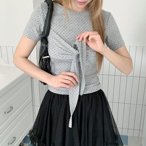 [옷자락] 여자 러블리 데이트룩 도트 리본 반팔 티셔츠