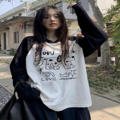 메이징 여성 봄가을 루즈핏 벌룬 소매 후드 프린팅 맨투맨 티셔츠