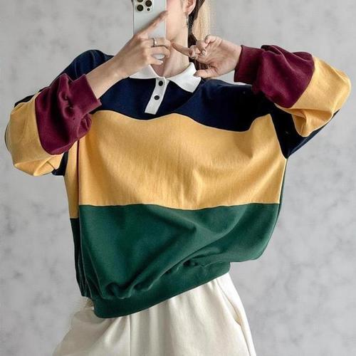[옷자락] 여자 라벨 럭비티 반오픈 카라넥 스트라이프 맨투맨