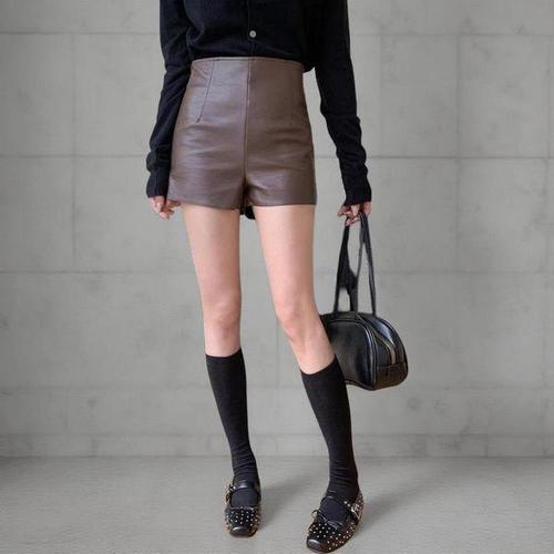 [옷자락] 여성 힙무드 사이드지퍼 핀턱 가죽 숏 팬츠