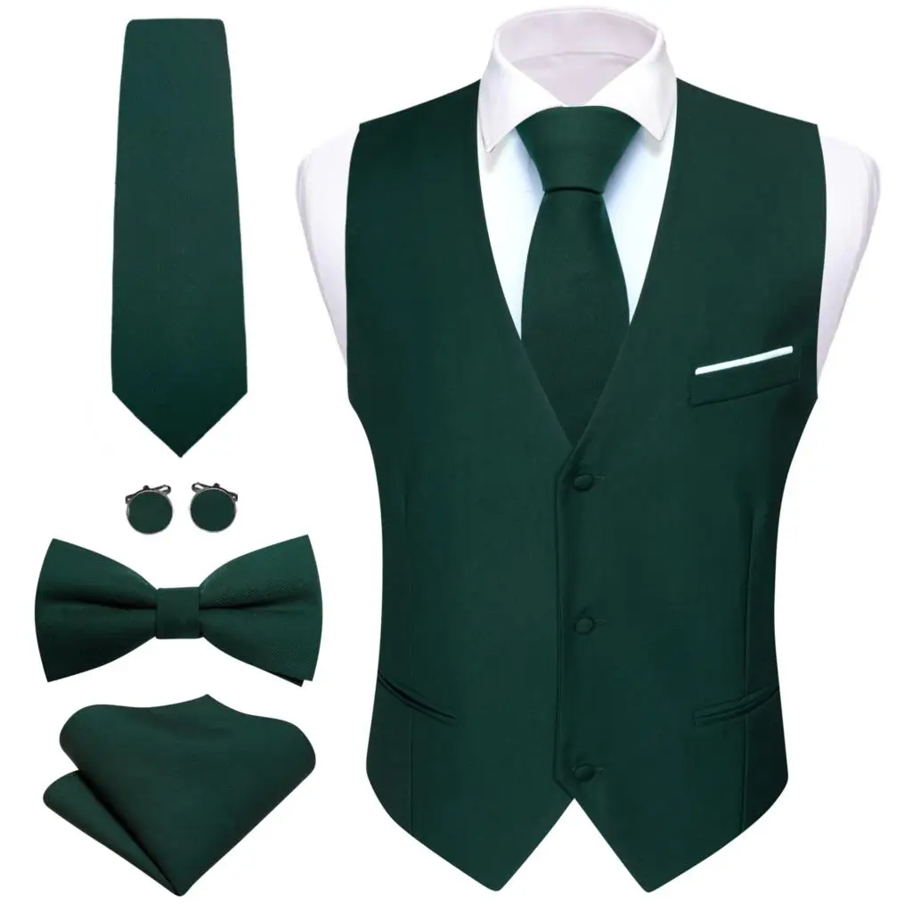 디자이너 남성 조끼 짙은 녹색 솔리드 실크 새틴 양복 조끼 넥타이 Bowtie Hanky 웨딩 정장 남성 정장 민소매 자켓 Barry Wang