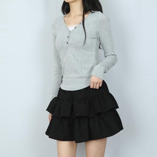 [엘루이즈][엘루이즈] 플루링 넥레이스 셔링 버튼 실리본 레이어드 티셔츠(6color)