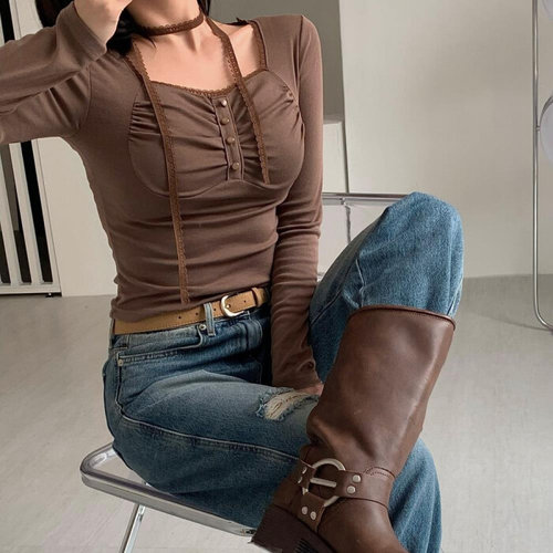 [옷자락]여자 레이스타이 셔링 단추 슬림핏 롱슬리브 티셔츠