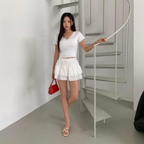 유니픽여성 여름 슬림핏 겹쳐 입는 V네크라인 버튼 반팔 티셔츠 레이스 장식 면 상의ddn