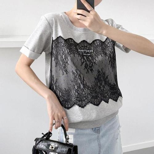 [옷자락] 여자 레이스 레이어드 배색 라운드 단가라 반팔 티셔츠