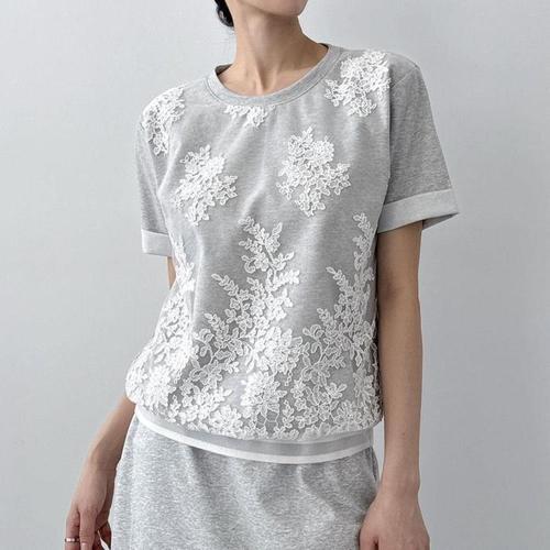 [다잇템]여자 레이스 꽃무늬 외출룩 롤업반팔 SS 티셔츠 (15005274A)