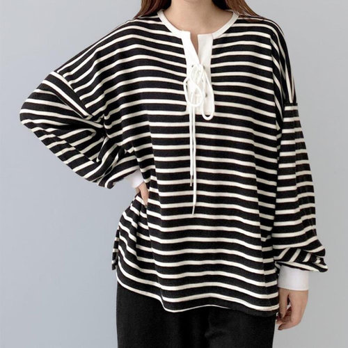 [옷자락]여성 아이렛 레이스업 스트라이프 맨투맨 통바지 세트