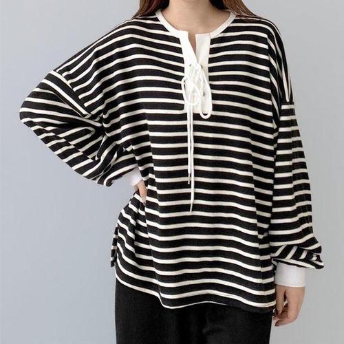 [옷자락] 여성 아이렛 레이스업 스트라이프 맨투맨 통바지 세트