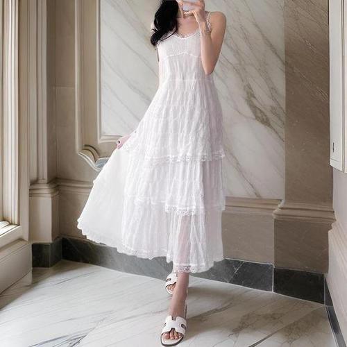 여성 레이스 SS 어깨끈 롱 티어드 원피스