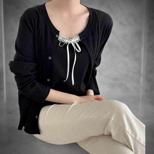 [옷자락]여성 레이스 배색 리본 나시와 박시 라운드 가디건 세트