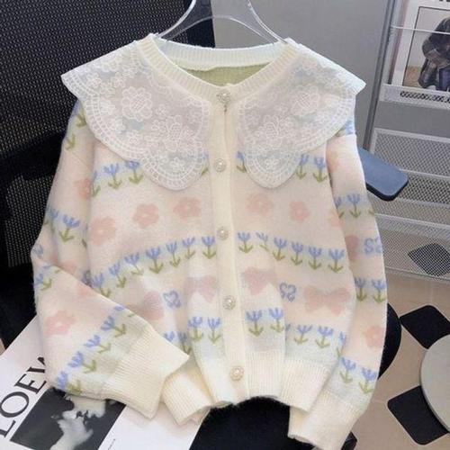 [신상오픈런]여성 클래식 비스코스 레이스 프릴 니트 카디건
