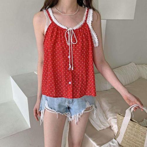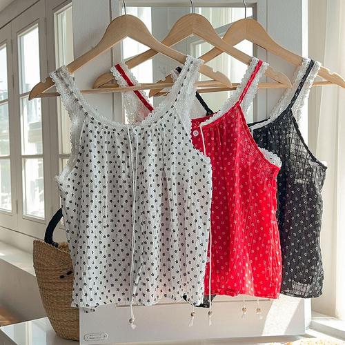 여성 귀여운 코디 꽃패턴 레이스 나시티