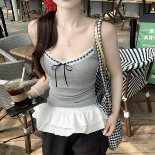 여성 썸머 캡내장 레이스 리본 골지 나시티