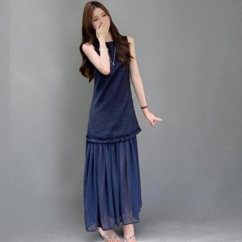 [옷자락] 여성 민소매 레이어드 프릴 레이스 롱 원피스