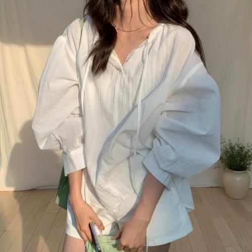 [오너클랜]인기상품 여성용 봄가을 반목 레이스 시스루 루즈핏 화이트 블라우스 [WFLLRMR_260305]