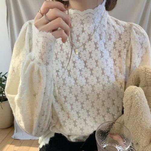 레이스 시스루 하이넥 블라우스 퍼프소매 여성 탑